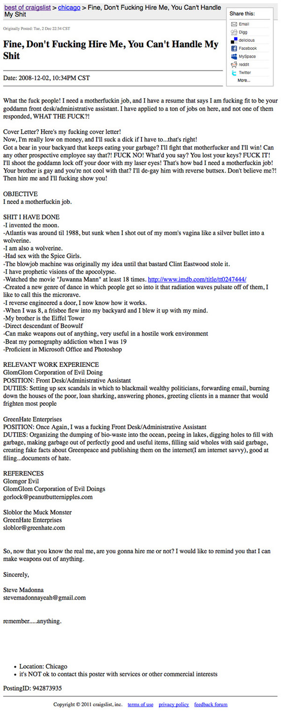 May 24, 2011November 25, 2021 by BIRD GEI | Consultoria e Gestão de Idiomas Bookmark 13 completely insane resumes that may actually be better than yours Source: http://www.someecards.com/2011/04/18/completely-insane-resume-that-may-actually-be-better-than-yours Share this/Compartilhe: Click to share on Facebook (Opens in new window) Facebook Click to share on X (Opens in new window) X Click to share on LinkedIn (Opens in new window) LinkedIn Click to share on Tumblr (Opens in new window) Tumblr Click to share on Reddit (Opens in new window) Reddit Click to share on WhatsApp (Opens in new window) WhatsApp Click to share on Pinterest (Opens in new window) Pinterest Click to print (Opens in new window) Print Click to email a link to a friend (Opens in new window) Email Like Loading... Related
