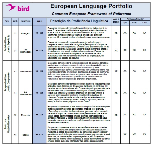 Cliente seleciona a proficiência desejada de acordo com a coluna BIRD