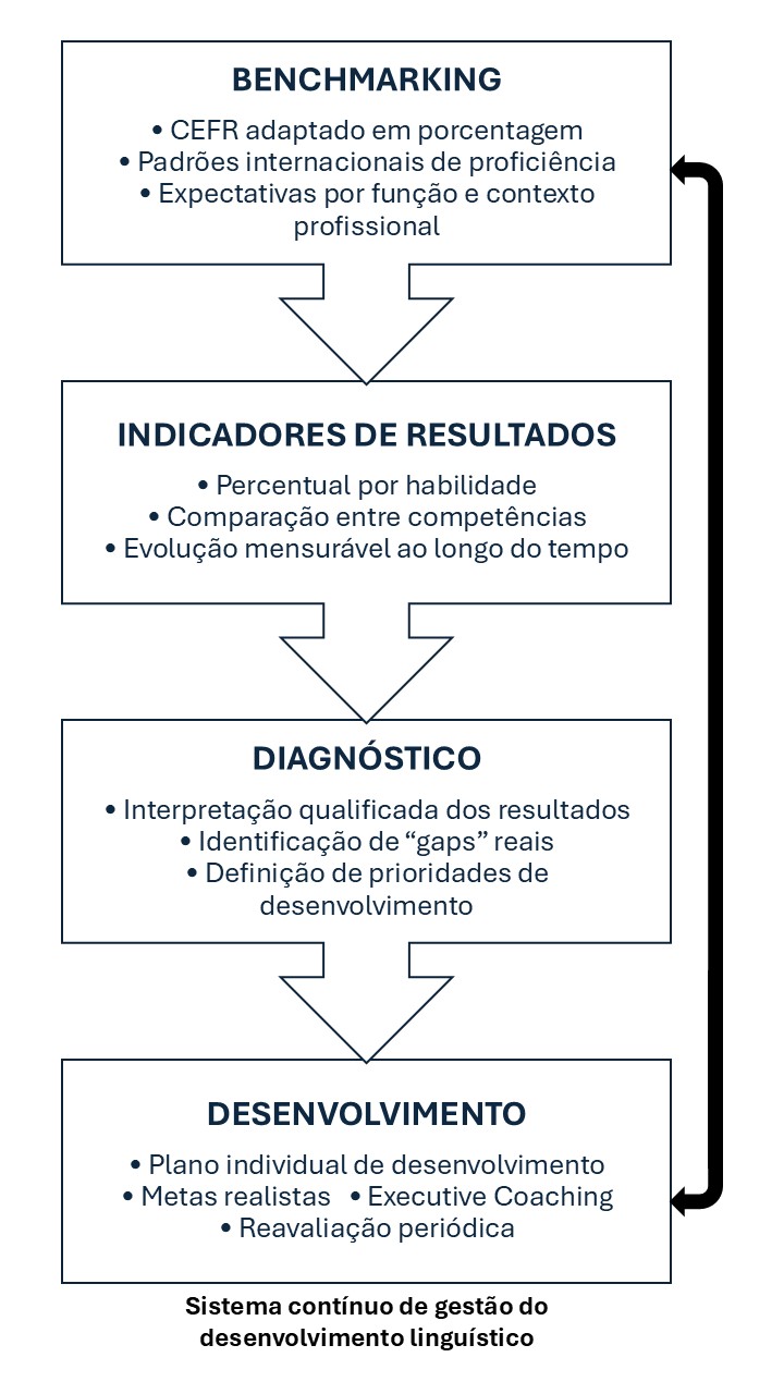 Um sistema de gestão do desenvolvimento linguístico, baseado em quatro etapas integradas: Benchmarking, Indicadores de Resultados, Diagnósticos & Desenvolvimento. Esse sistema garante que toda avaliação gere dados claros, todo dado gere diagnóstico, e todo diagnóstico resulte em desenvolvimento mensurável.